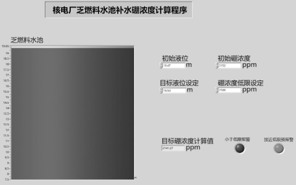 根据上述计算方法,可将初始液位、初始硼浓度、目标液位作为输入量,利用计算公式,计算出补水后的目标硼浓度,同时设定硼浓度低限,用于与目标硼浓度计算值比较,触发报警灯用于提醒,考虑到硼浓度取样地误差,设置预报警灯(高于硼浓度低限50ppm)用于警示,若目标硼浓度计算值触发预报警灯亮(红色),则在乏池液位低,需要补水时,不能补充来自核岛除盐水系统(SED)的清水,而需要补充硼水。