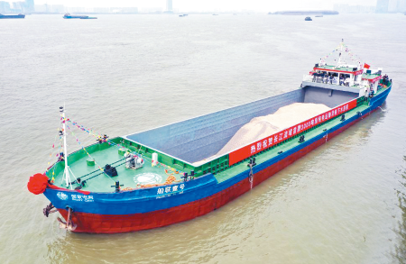 2月22日,“船联1号”电动货船在长江南京段航行(无人机照片),长江流域首艘3000吨级纯电动货船“船联1号”在南京首航。该船由原来总载重3000吨位的燃油货船改造而成,把电能作为整艘船的唯一能源,实现零排放、低噪音、无污染。
