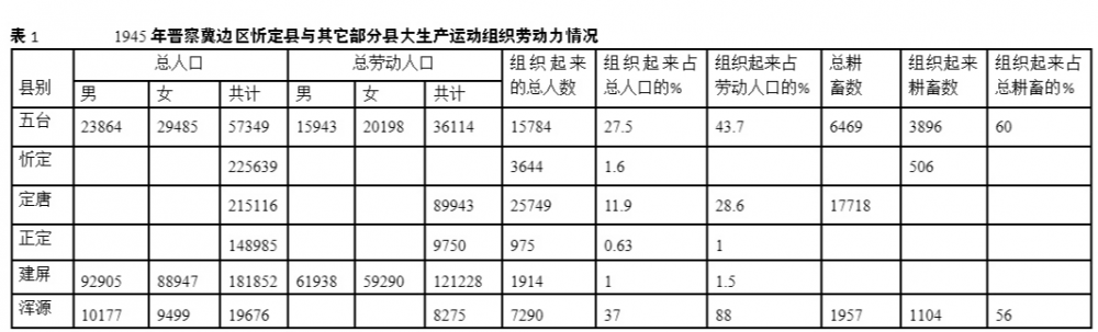 如上文所言,忻定县各地区通过组织动员努力,很大一部分劳力被组织起来,共同投入到大生产运动之中。忻定县的组织动员取得一定成效,见表1。
