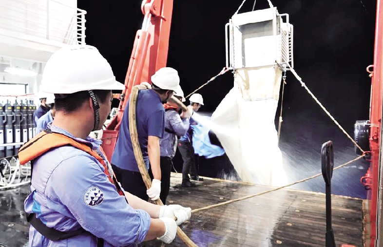 9月6日,“深海一号”船上,科考队员和船员对回收至船上的浮游生物分层拖网设备进行冲洗。