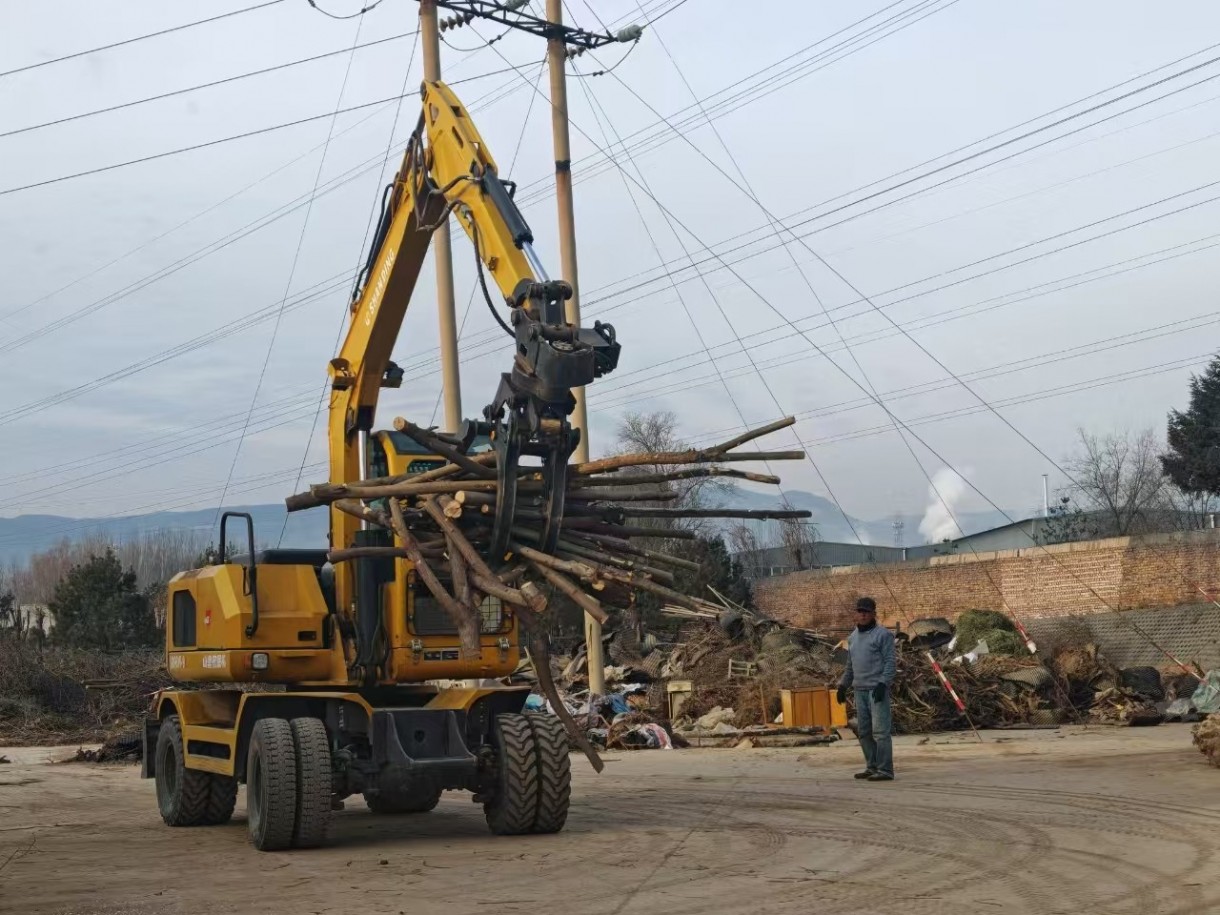 当天,记者走进太原市园林绿废生态科创基地(以下简称生态科创基地),看到这里的挖掘机正在工作,只见挖掘机将散落的粗树干聚拢在一起,随后再抓举起来放进粉碎机,听见“咔嚓咔嚓”的粉碎声,一节节2~3厘米的小木块就“脱机”而出了。