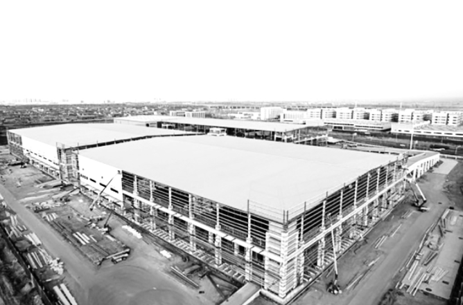 该项目于2024年3月6日进场施工,项目部倒排工期、挂图作战,先后完成建渣、碎石强夯置换、土方回填和预制管桩工程等。2024年7月份进入地上结构施工阶段后,项目建设不断加速,最高峰时有700多名建设者在现场奋战,昼夜加班加点,各单体同时施工,用时30天完成60重型盘扣架架体施工,41天完成1、2、3号仓库及卸货平台顶板施工,并于2024年国庆节完成3栋生产仓库及卸货平台一层混凝土施工,2024年10月6日启动二层钢结构安装,2024年12月6日顺利完成主体封顶的任务目标,比预期工期提前近10天。