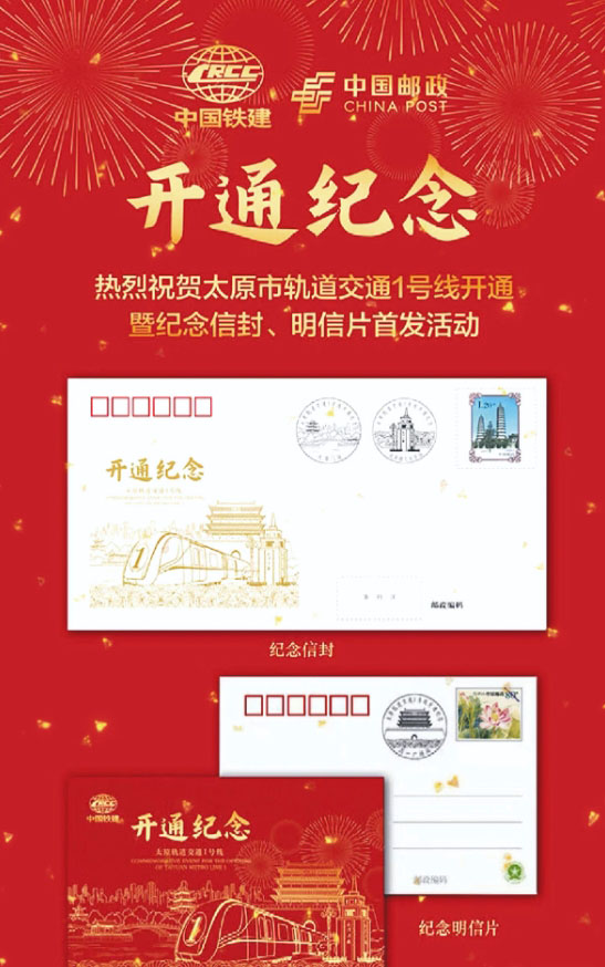 中国邮政发行太原地铁1号线开通纪念封、明信片。