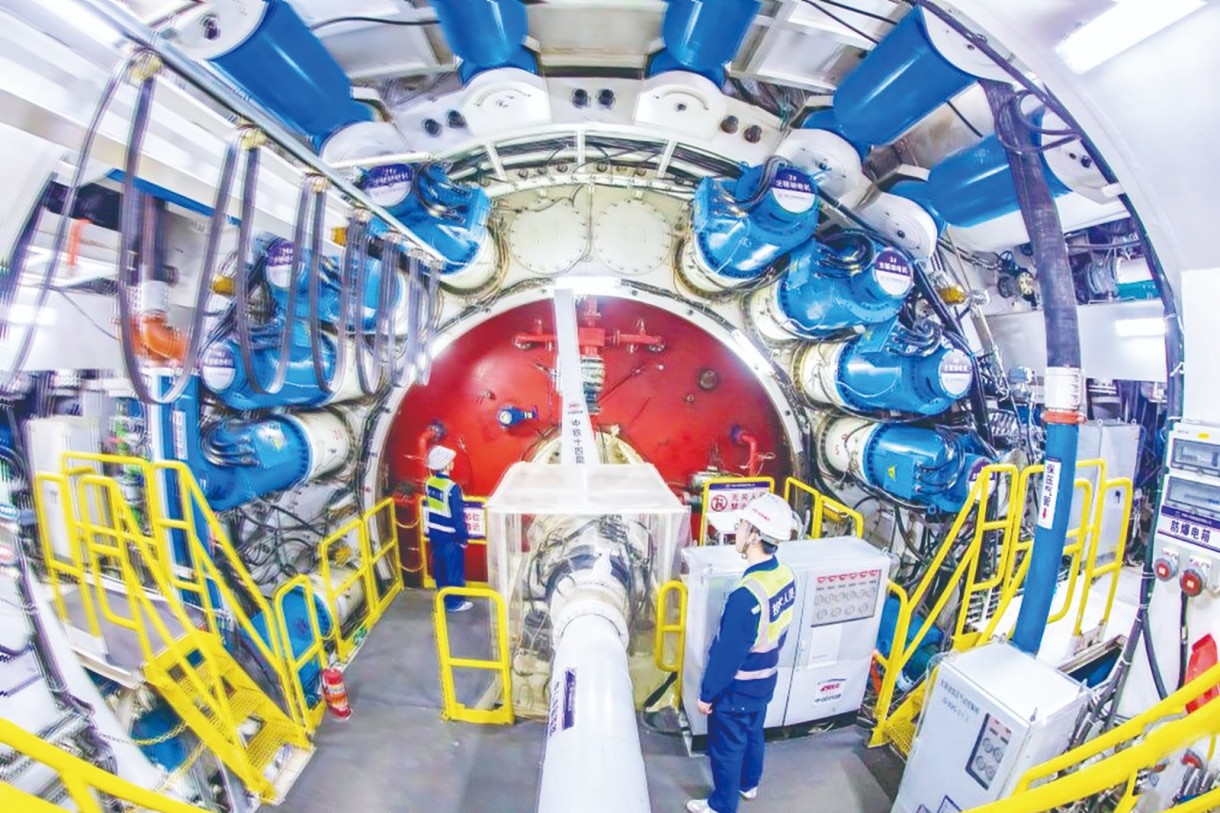 2月6日,中铁十四局技术人员在甬舟铁路金塘海底隧道宁波侧检查“甬舟号”盾构机刀盘运行状态。