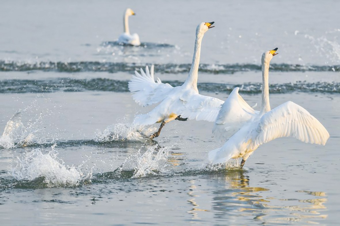 运城、三门峡有关部门提供的数据显示,黄河两岸天鹅数量近年来出现跨越式增长。越冬大天鹅在运城盐湖从十年前的零星可见,增长到今年的470多只;芮城圣天湖从20世纪90年代末的几十只,跃升至如今的7000多只;平陆三湾湿地从20多年前的2000只,稳定增长至如今的过万只。在三门峡,大天鹅的数量突破1.6万只。