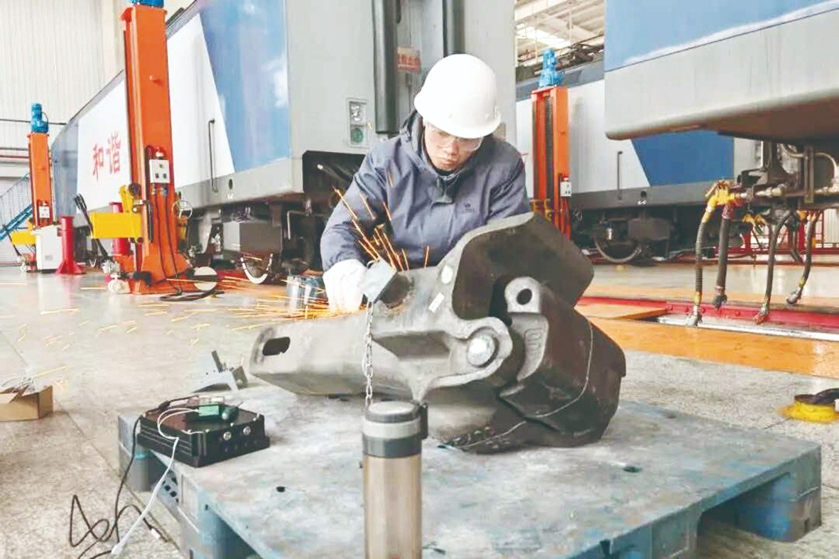 在车间打磨列车部件