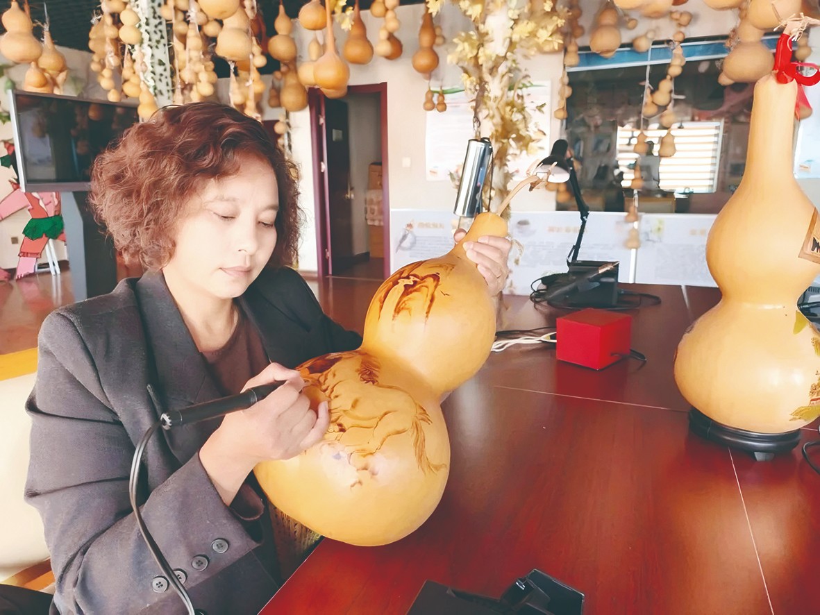 在荆俊丽的带动下,连庄村及周边乡村的妇女们开始种植葫芦、学习技艺,一条“种植+加工+文旅”的产业链逐渐形成。“以前每天围着灶台转,现在通过学习烙画葫芦技艺,也算成了月月有收入的‘手艺人’。日子过得踏实,心里也敞亮多了。”员工刘聪平笑着说。