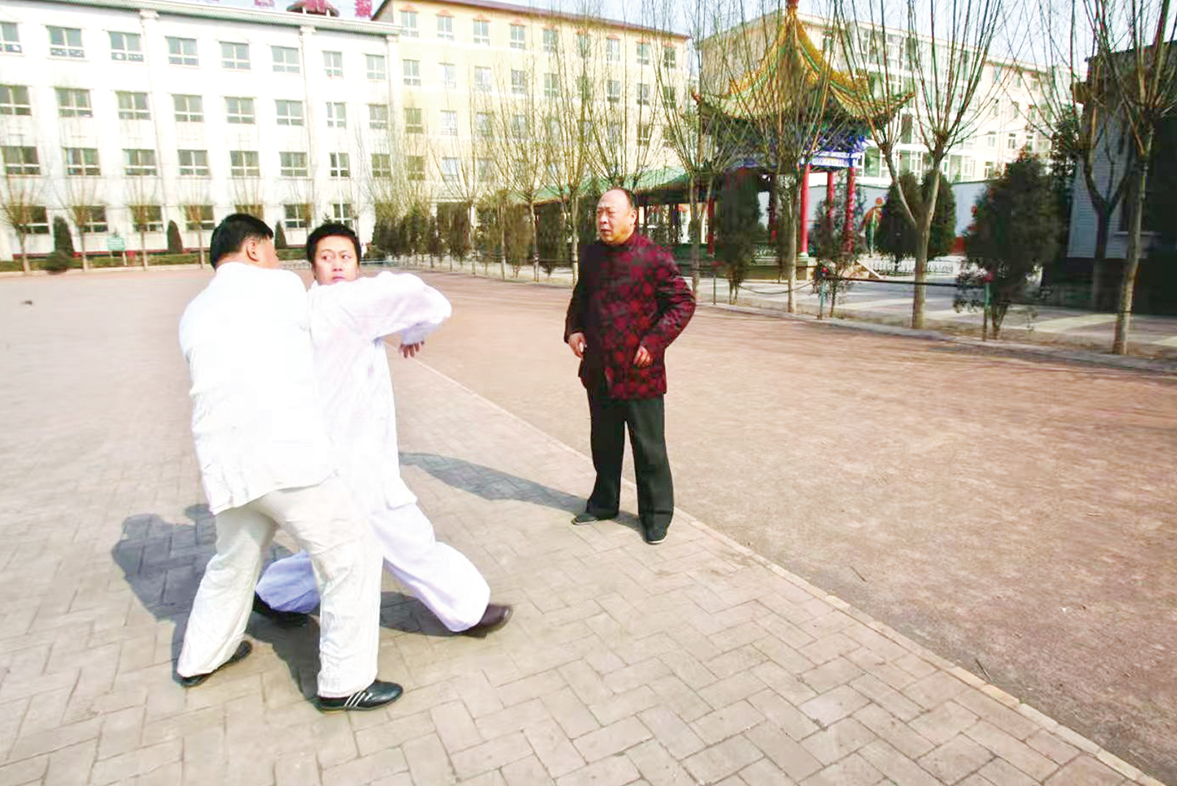 梁晓峰(右)正在辅导弟子“武术王子”原文庆肘法