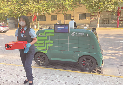 阳泉市矿区邮政公司工作人员接收无人投递车送来的邮件