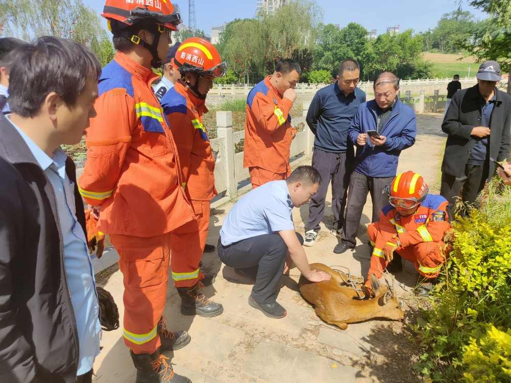2023年5月23 日 8 时 41 分,黎城大队接119指挥中心调度称:黎城县东河游园有只“鹿”掉进水里,被困上不了岸。接到报警后黎城大队立即出动 1 车 6 人赶赴现场进行处置。